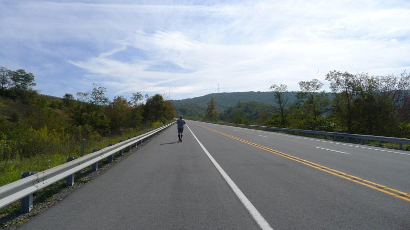 The first couple of miles were nice – flat-ish, through a little town. Nice. Then we started up a long, straight hill on the highway that was one of those where they add extra passing lanes and you just go straight up the hill. My van was able to stop and cheer me on and offer water, but I was afraid if I stopped I would struggle to get going again. When I neared the top of that section, they were there with water, cheering, and a funny little exchange happened.