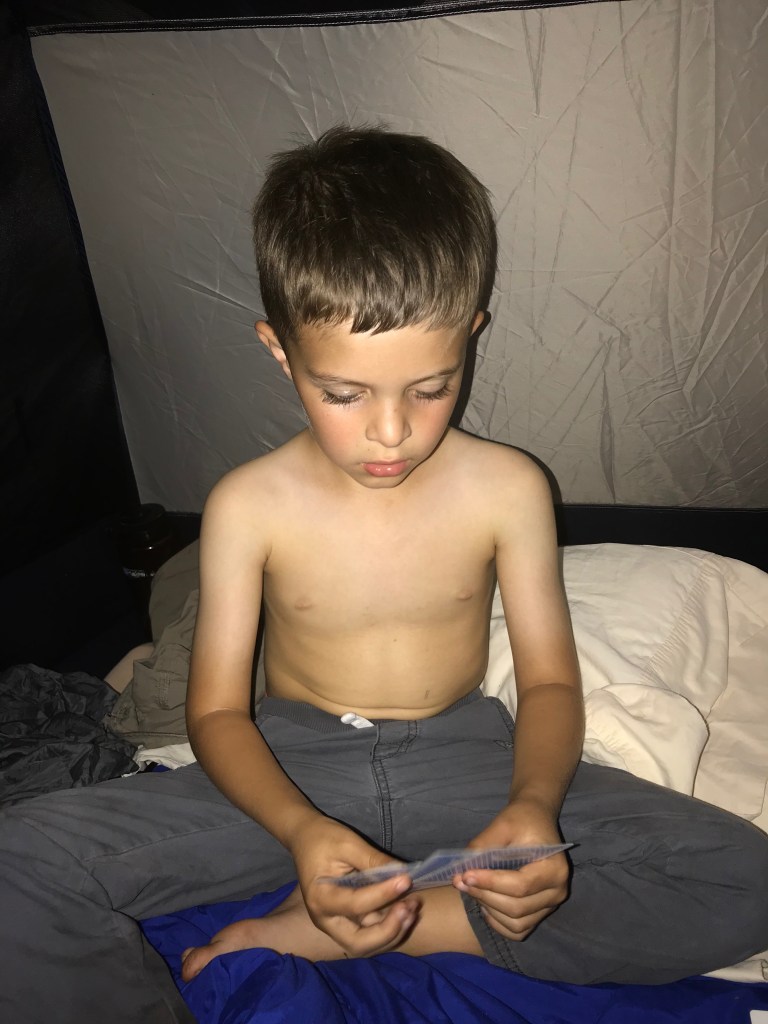 Back at camp, we spent only a few minutes outside before we got into the tent to avoid the bugs. Warm tents tend to be stuffy, but stuffiness is better than being mauled by bugs, and we played cards to pass the time. Go Fish with a six-year old in a tent, that’s a Saturday night, right there. I slept well, which I attribute to my weight loss. The little sleeping pads I use aren’t designed for people as enormous as I used to be. The stuffiness went away, too – the temperatures got down into the 50s, and while I fell asleep on top of my bag, I crawled in at some point in the night.